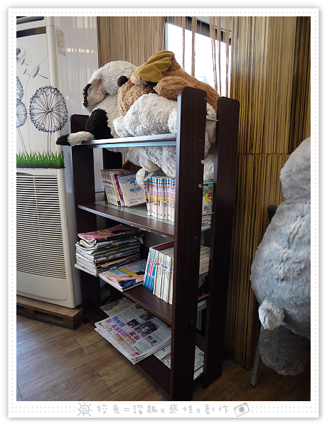 架子上陳列報紙、雜誌和漫畫書,小叮噹開心複習著航海王!
